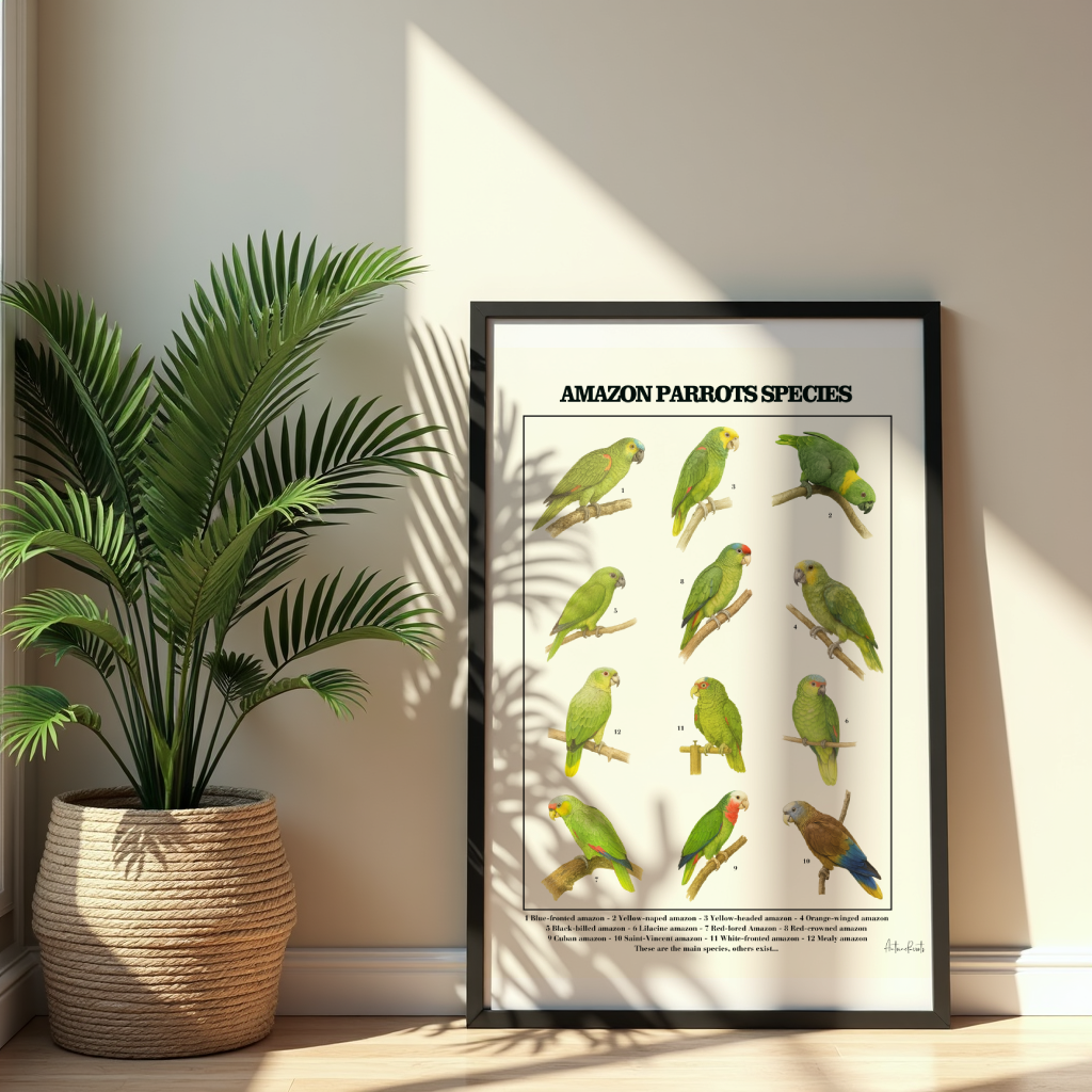 African Parrots Wall Art Print – Illustrated poster african parrot Species – Colorful Bird Poster for Bird Lovers and Home Décor