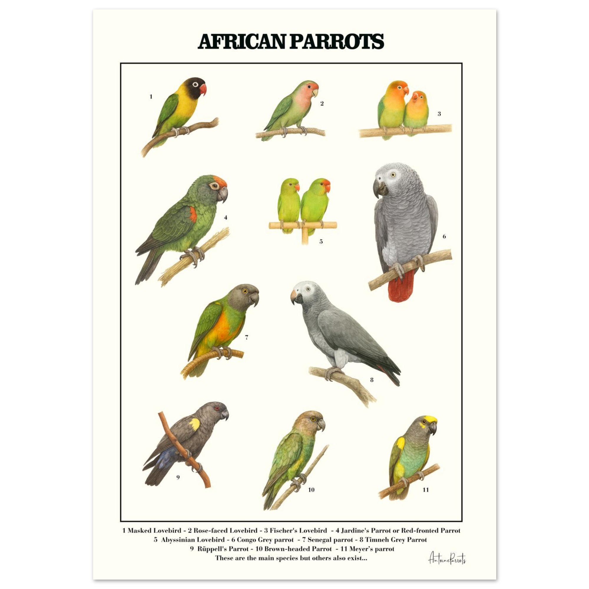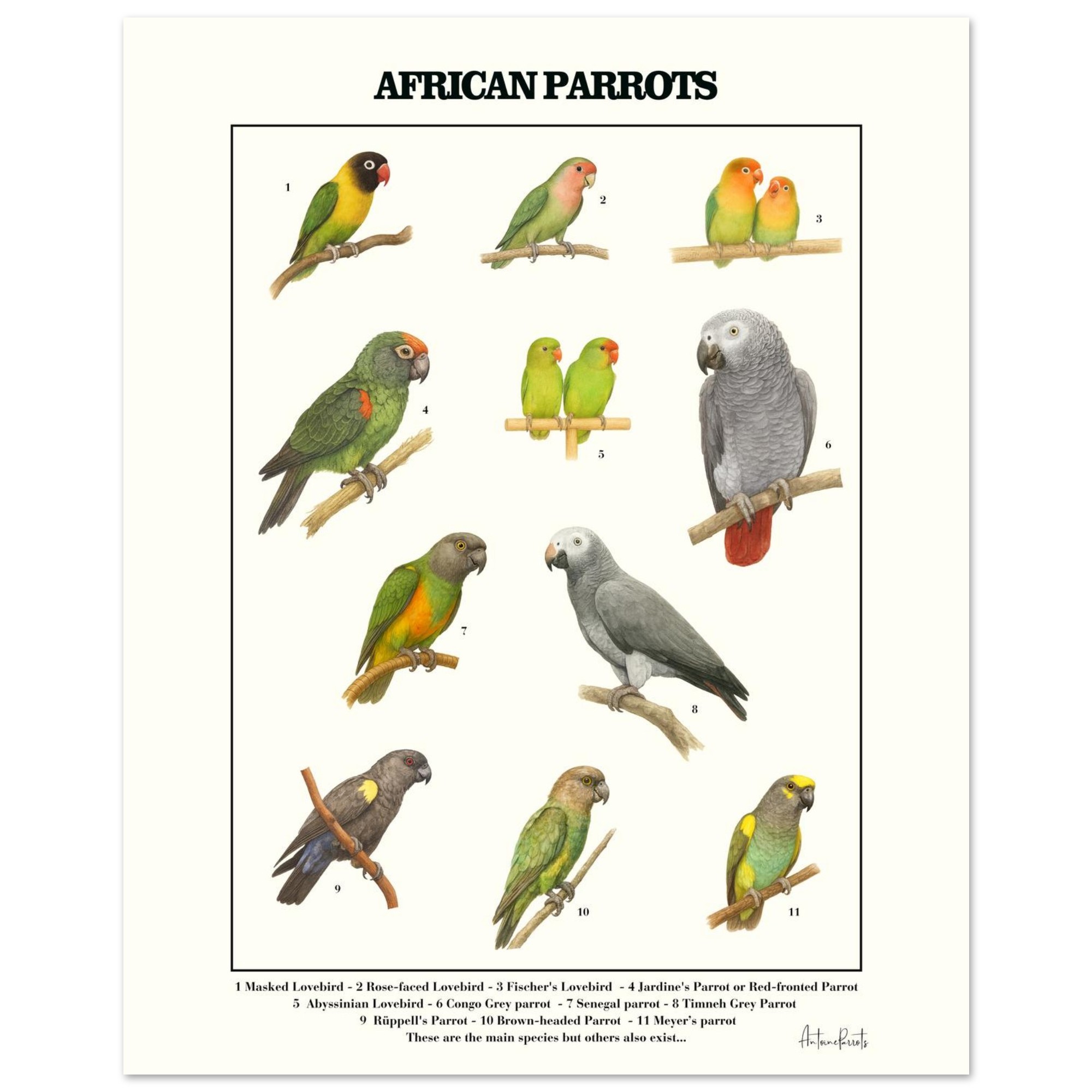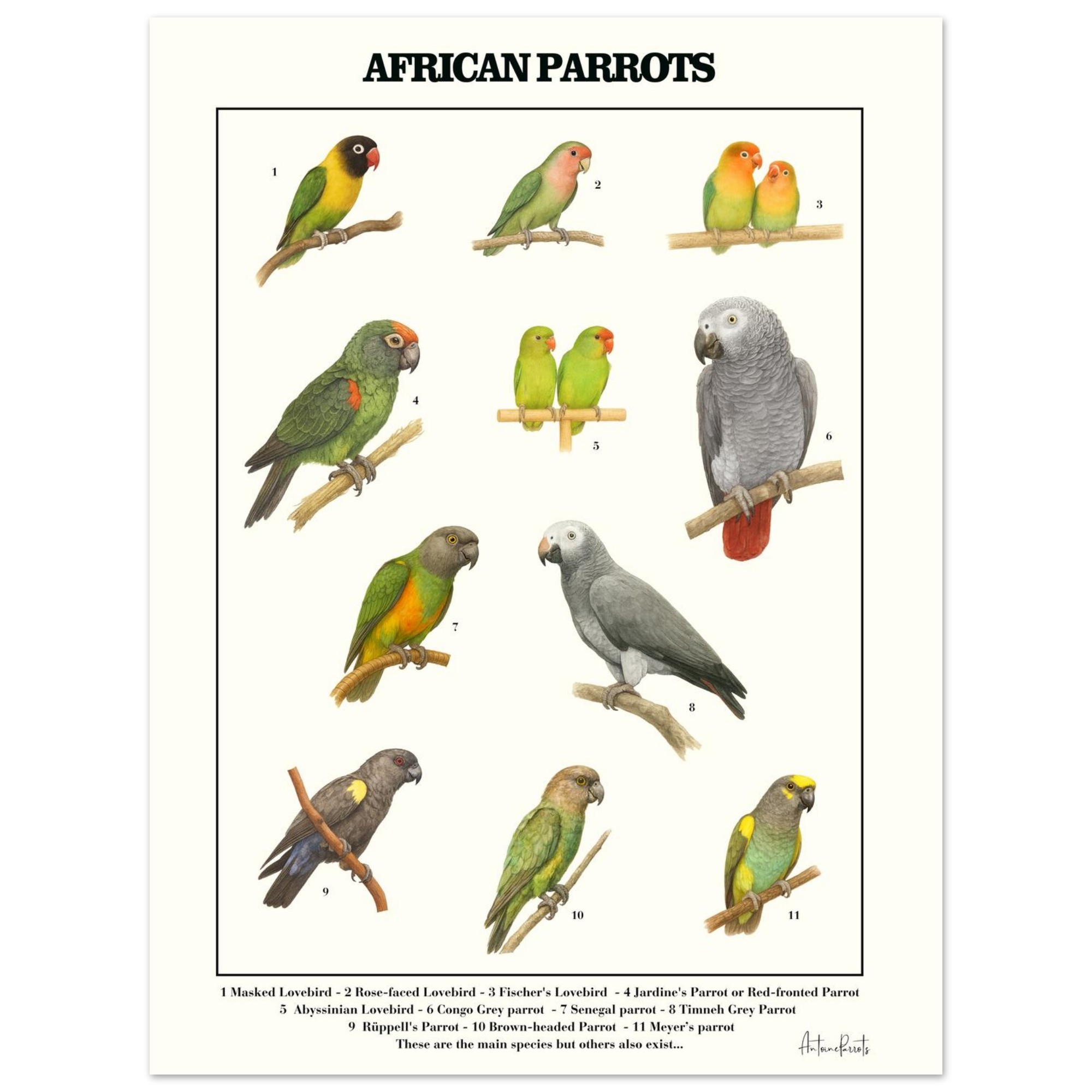 Beautifull illustrated educational poster featuring 10 iconic African parrot species.