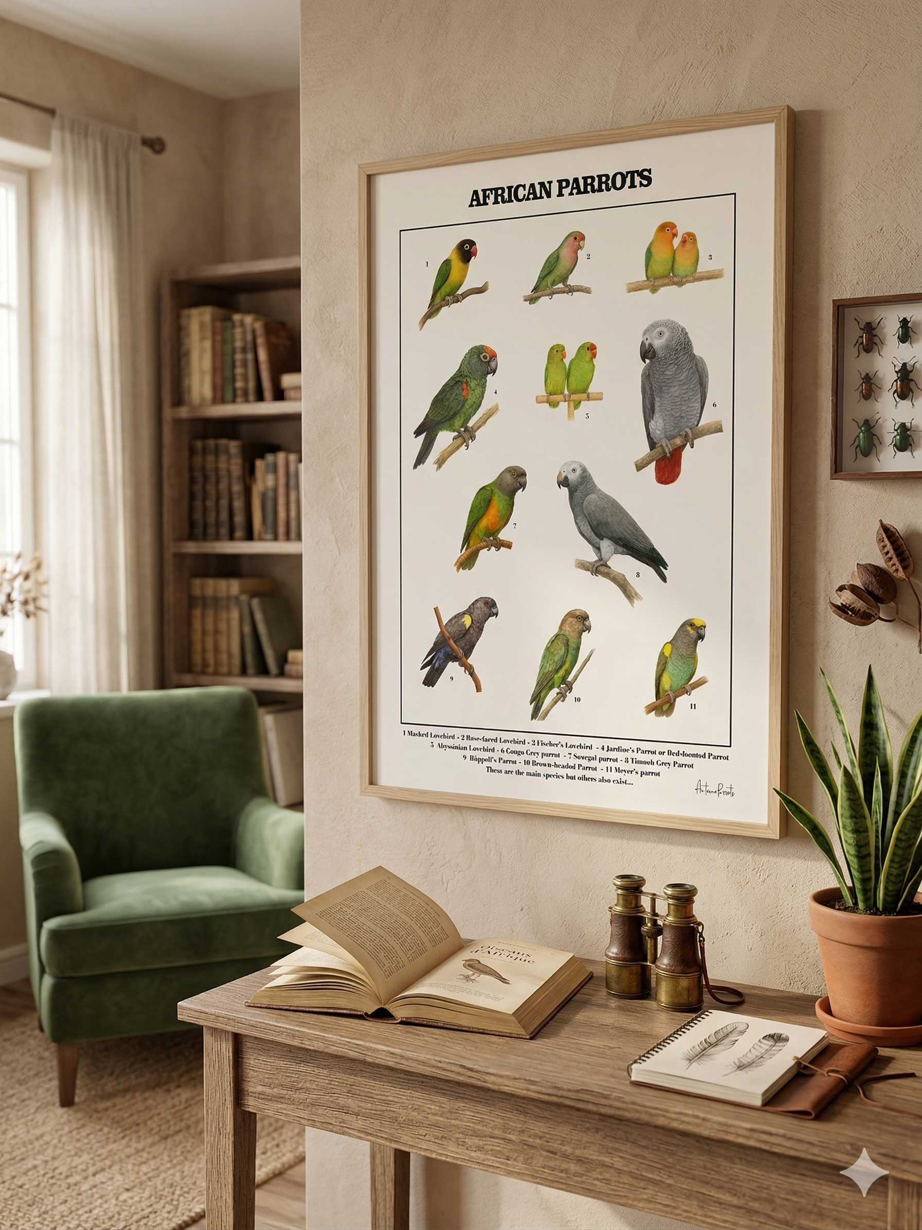 I made sure that each species is represented clearly and harmoniously, resulting in a piece that is both educational and highly decorative. Every single parrot drawing has been carefully checked and reviewed with parrot experts. You’ll find 10 different species naturalist drawing! Every bird is numbered to correspond with the legend at the bottom of the poster for easy identification.