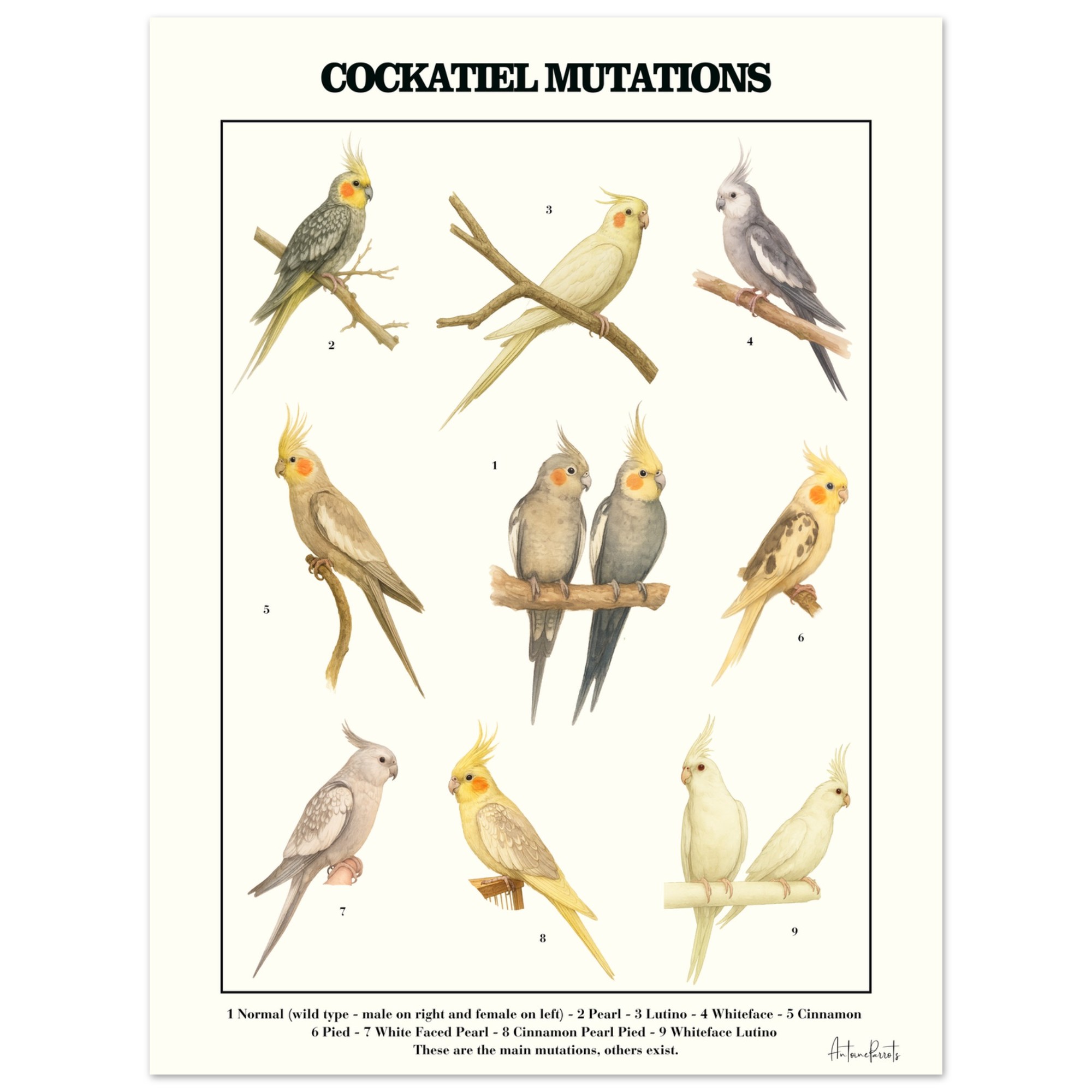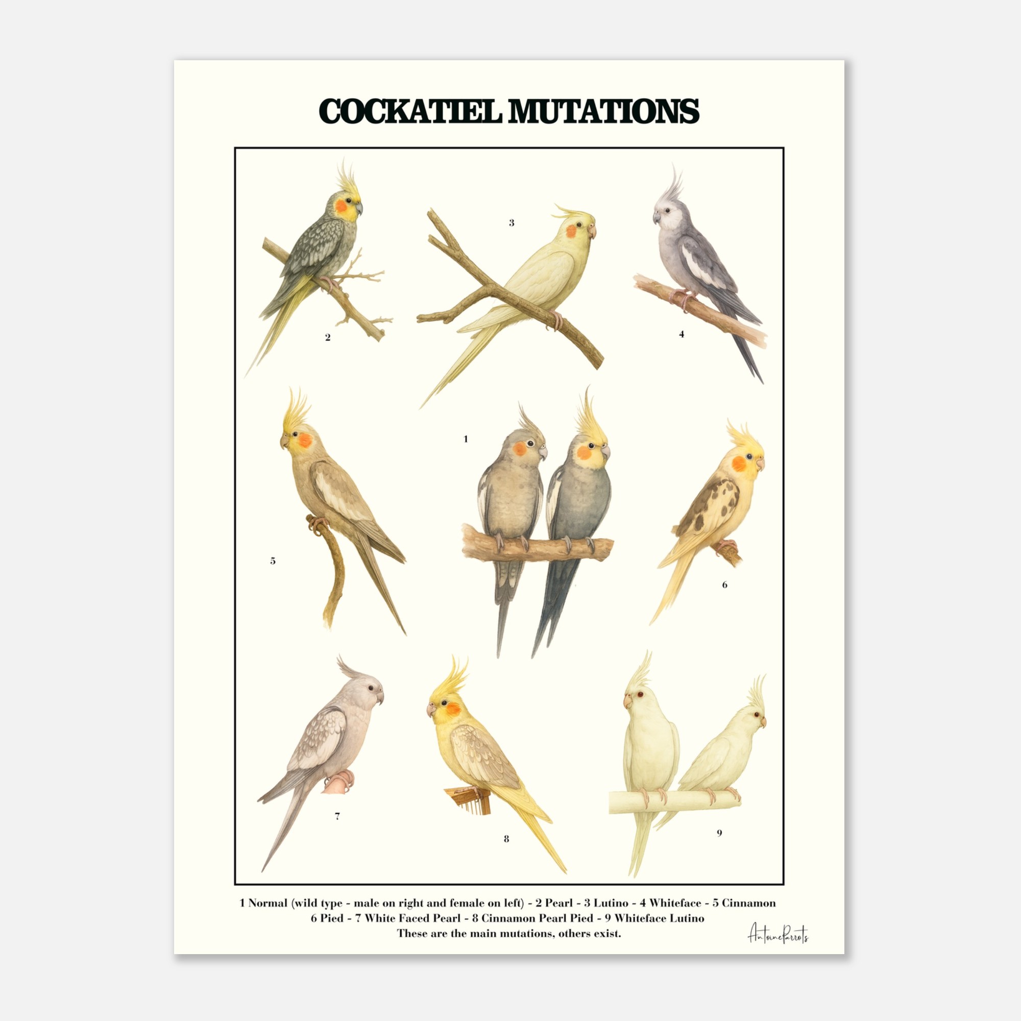 Cockatiel Mutations Poster – Hand-Drawn Bird Art Print – Parrot Wall Decor Cockatiel Gifts for Bird Lovers