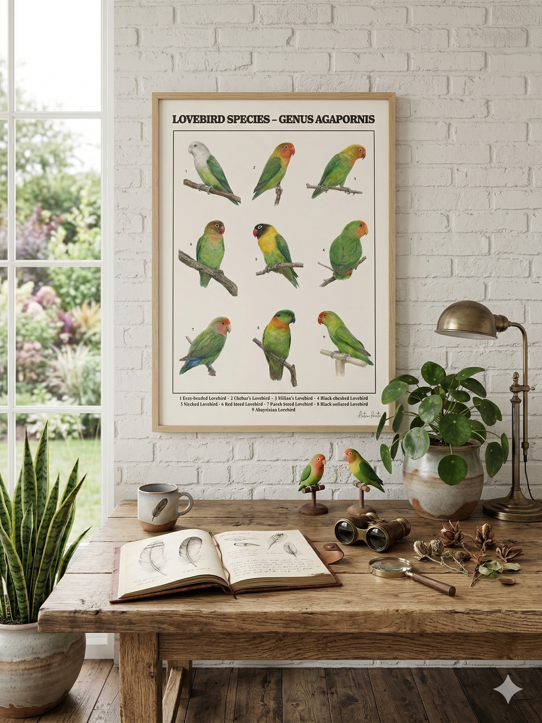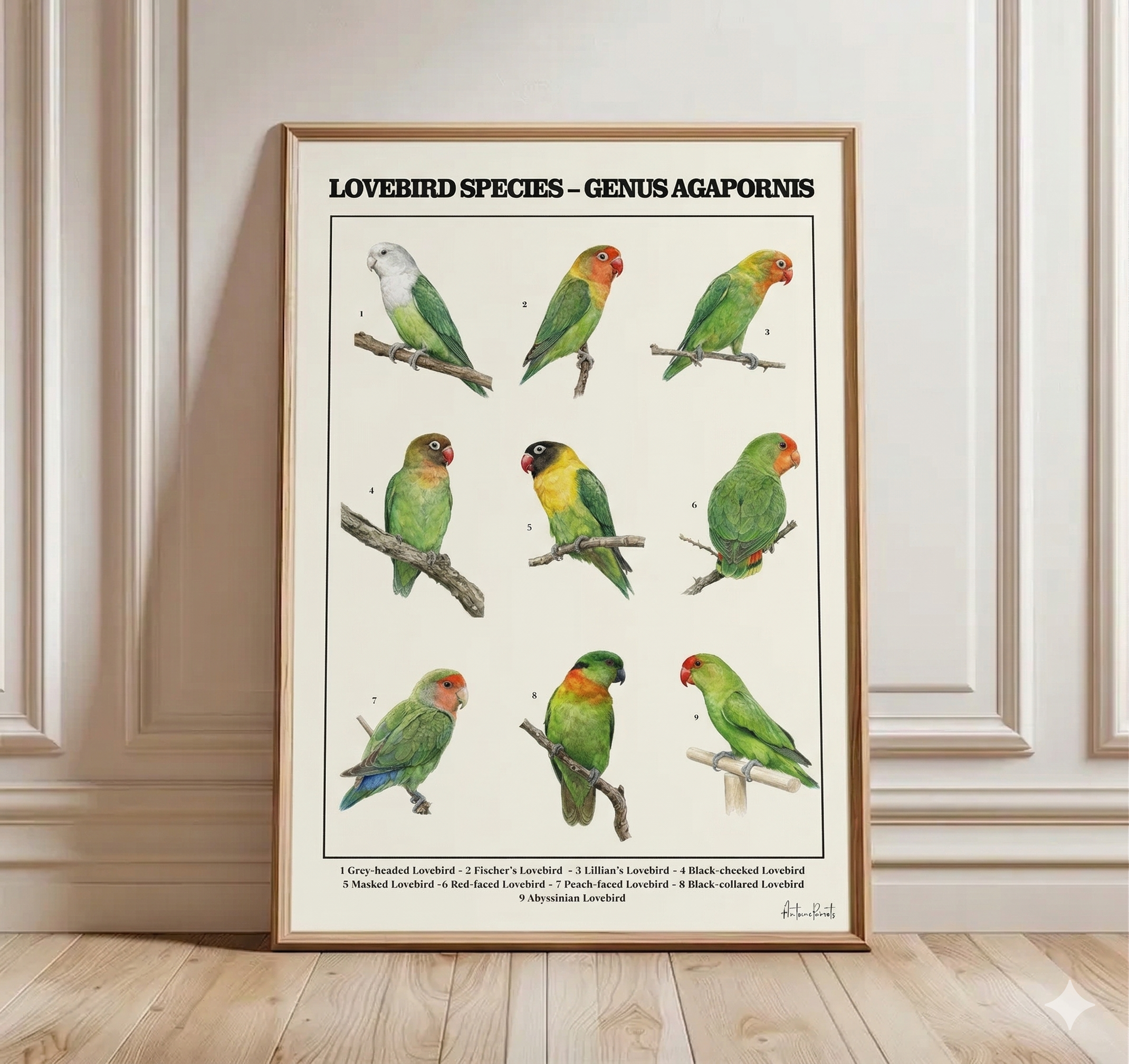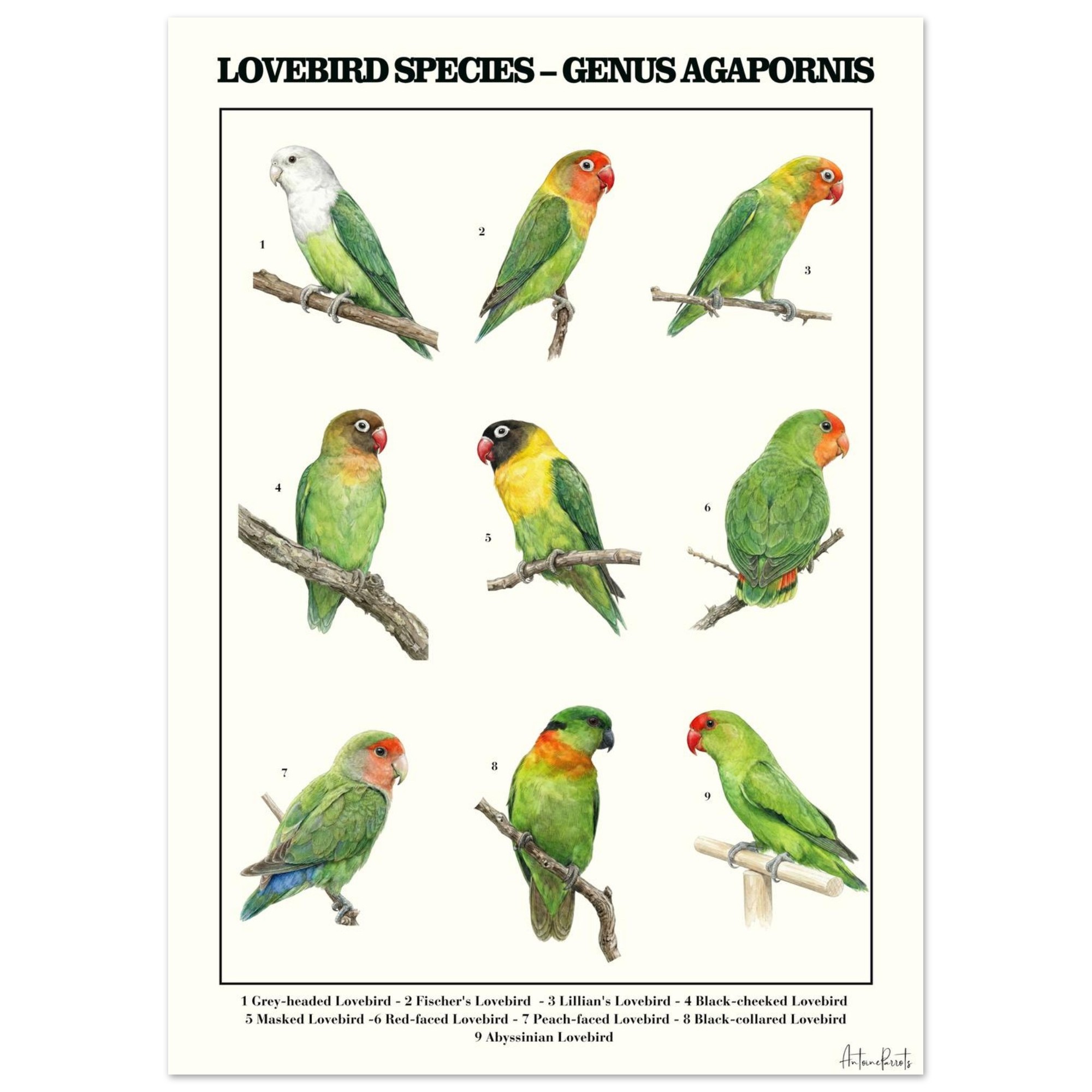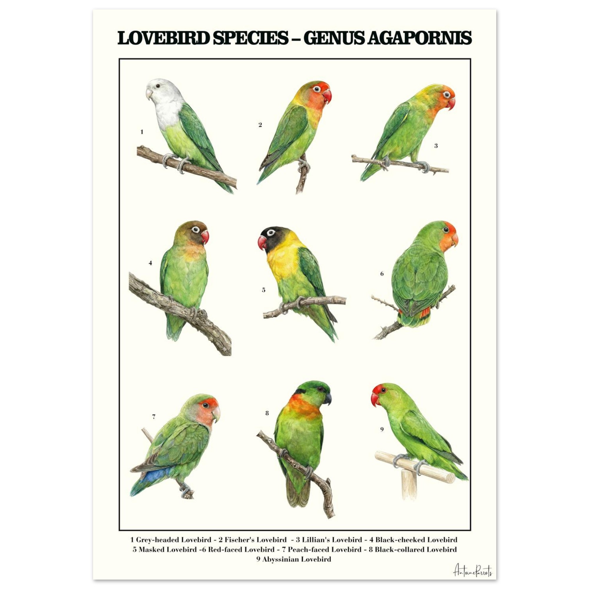 From the vibrant Fischer’s Lovebird to the elegant Grey-headed Lovebird, this artwork highlights the unique characteristics of each species while maintaining a timeless scientific aesthetic inspired by traditional natural history plates.