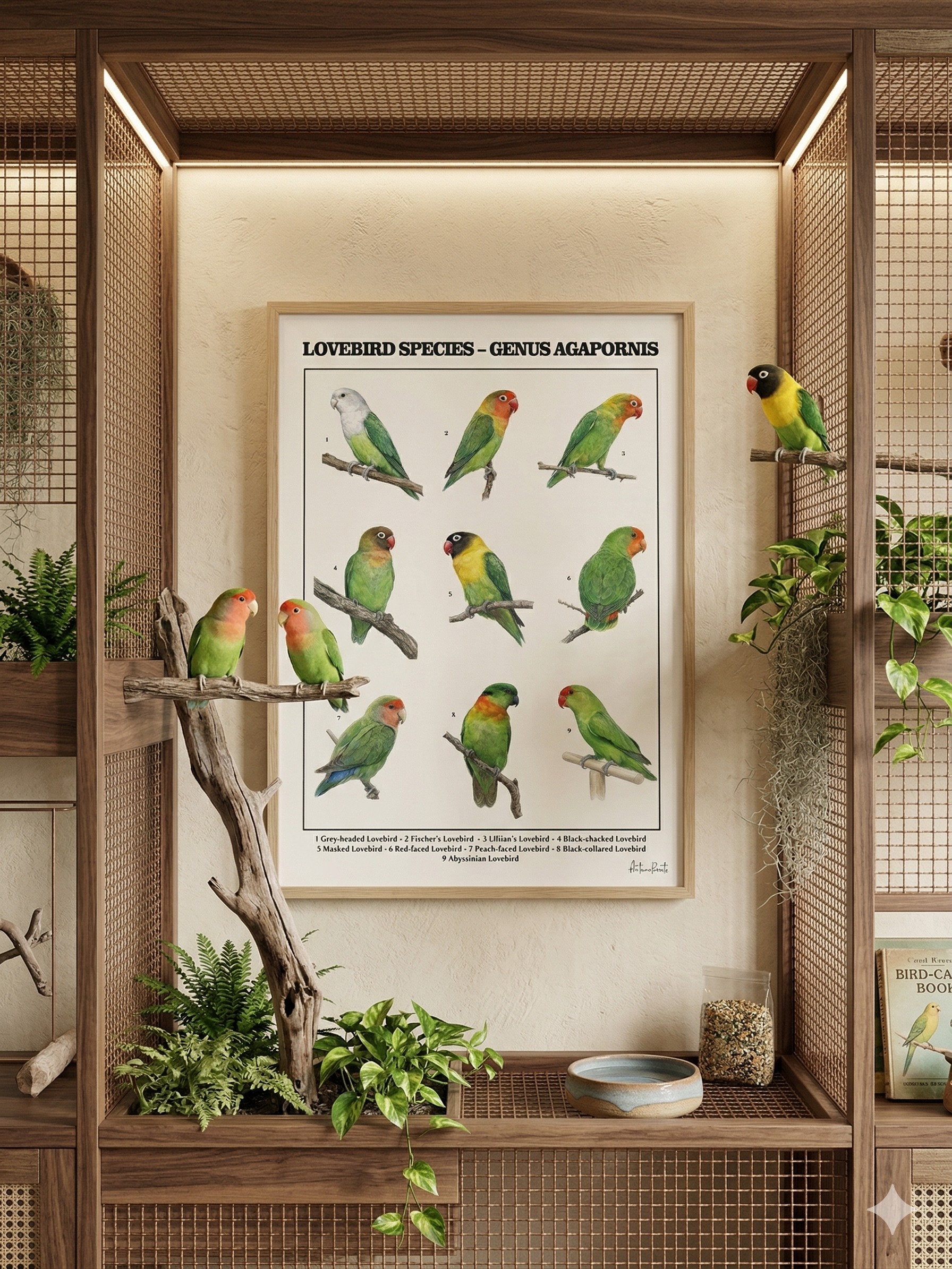 Discover the diversity of lovebirds with this detailed Lovebird Species natural history poster.